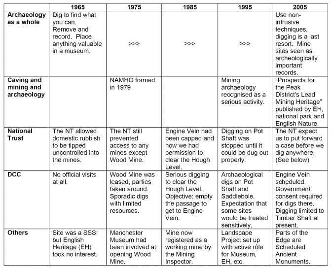 The Club's interests at the Edge have shifted over time from simple exploration of lost mines through discovery of more about the mines to true archaeologically structured research. To some extent, opportunities still exist for the earlier type of activity although much more care is now taken to preserve evidence of early working but the emphasis has shifted towards more academic research. This change is documented in the table below which formed part of the discussion with the National Trust when our current system of work plans was developed.