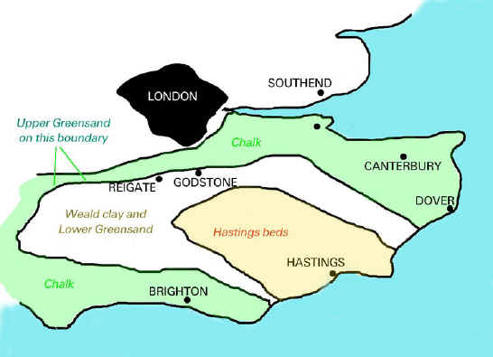 The area we visited was on the boundary of the chalk and lower greensand where the harder rocks of the upper greensand are exposed. The sketch map below shows the area as well as the basic geology of the Weald.