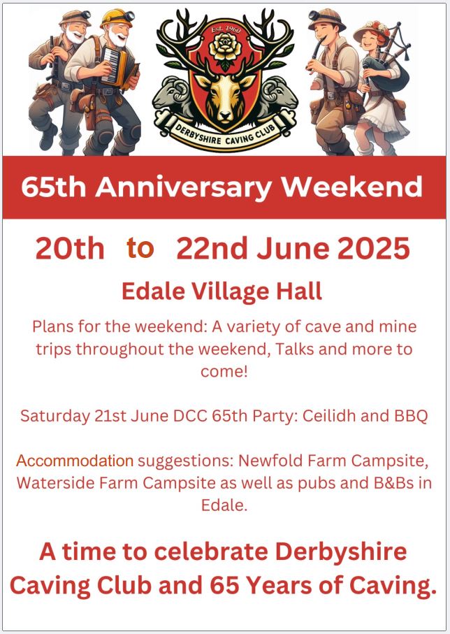 DCC 65th Big Summer Blow-out | | Venue: | Edale Village Hall | | Date and time: | Saturday 21/06/2025 - from - 1700 | | Space available: | tickets - Bookings closed at:23:59 on 20/06/2025 | | Further info: | The 65th celebration party is well into the preparation stage. The event will take place at Edale Village Hall (SK 12357 85337 or again.mingles.inferior) which we have booked from Friday to Sunday. A full programme of events is currently being prepared but it will probably include caving, mining and walking trips on Saturday and possibly Sunday (depending on members' fitness after Saturday night); a barbecue on Saturday night; and a Ceilidh as well on Saturday night. Deposits have been paid for the hall, the barbecue and the Ceilidh.